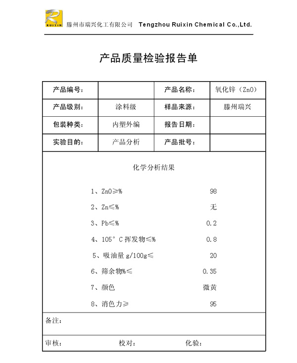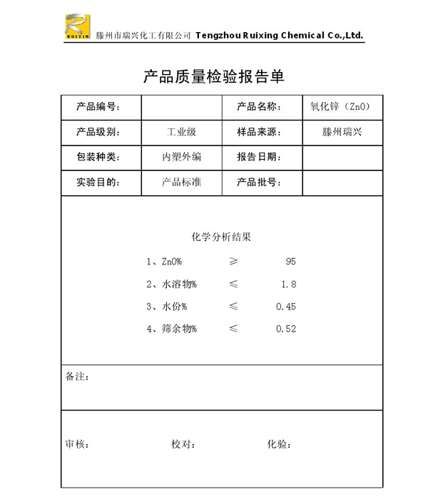 瑞興化工有限公司是生產(chǎn)氧化鋅的重點企業(yè),于2008年通過ISO9001:2008質(zhì)量管理體系認(rèn)證。“瑞興”牌氧化鋅在國內(nèi)擁有較大穩(wěn)定的市場,并遠(yuǎn)銷東南亞、中東、中南美等國家和地區(qū),在國內(nèi)外享有較高聲譽。